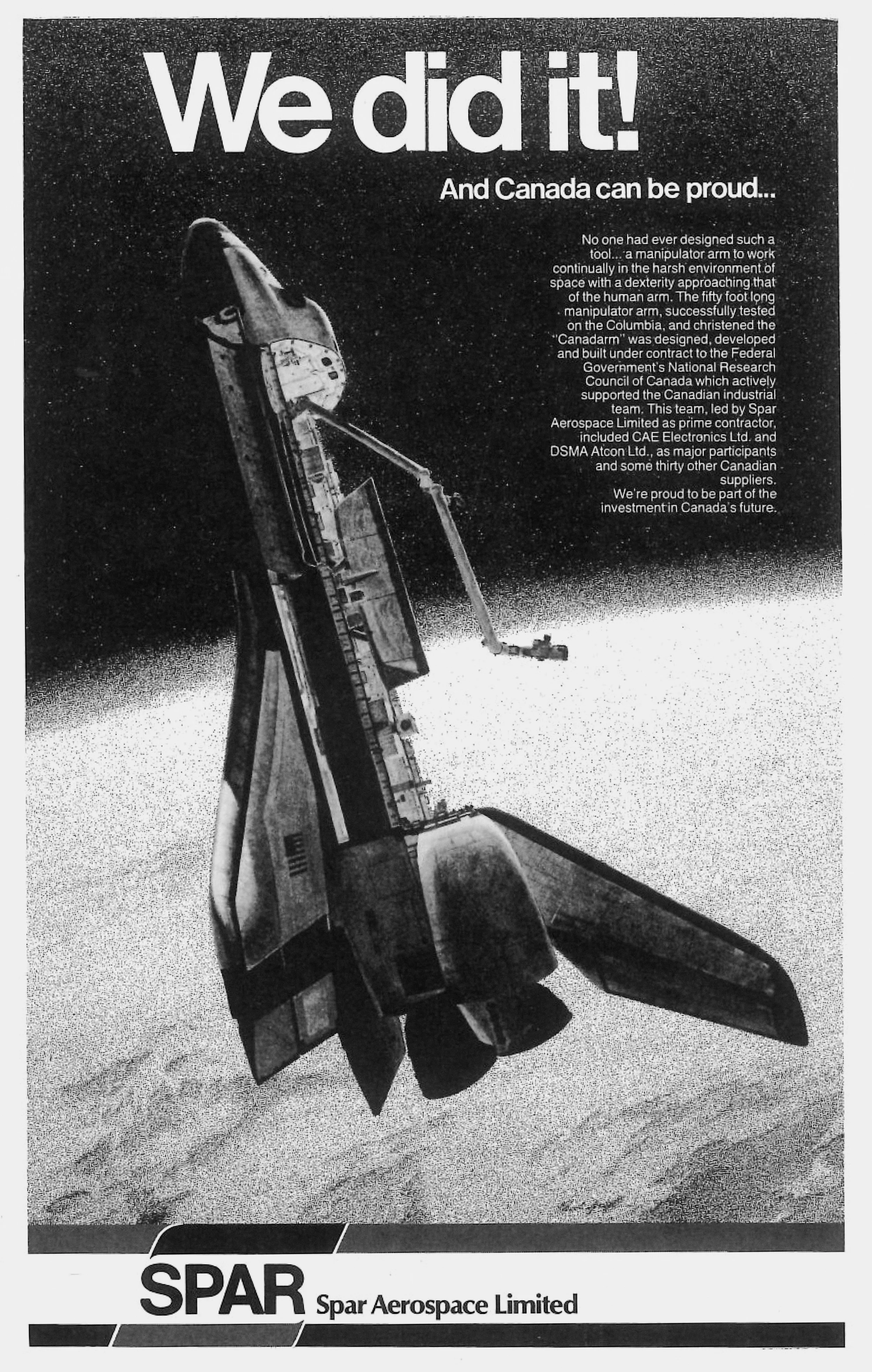 Spar Aerospace advertisement celebrating Canadarm, 1981.